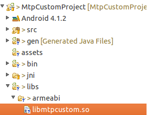 うまくビルドが通ればlibsフォルダ配下に俺アプリ専用のsoファイル libmtpcustom.soが生成されます。